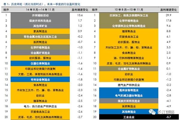 上一轮(14年补库)库存拐点(2014年8月)后一个季度,盈利端的行业比较排序:上游部分采掘>消费制造(可选>必需)>设备制造(工业>消费)>加工冶炼(石油化工>基本原材料);