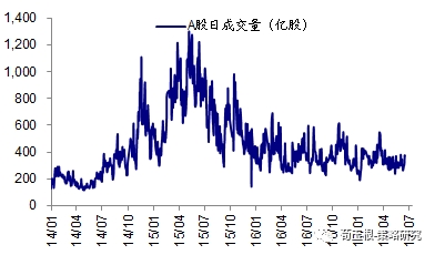 16年1月底以来日成交量高点分别为689亿股,低点为190亿股,上周为332亿股,较前一周上升,处于相对偏低水平。