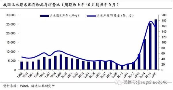 首先,本轮农业供给侧改革与工业供给侧改革的一个本质区别在于,库存水平不一样。工业品库存在16年初普遍位于历史低位,而以玉米为代表的农产品库存位于历史最高位,目前的玉米库存接近2.7亿吨,而在4年以前只有5000万吨。