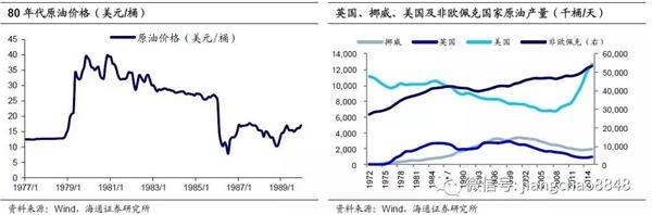 76年挪威和英国的原油总产量不过53万桶/天,由于北海油田扩产,85年英国原油产量已达270万桶/天,挪威产量也随后攀升,两国原油总产量占非OPEC的比重从76年的2%增至86年的9%。在新增供给的支撑下,油价难以维持高位,最终震荡下行。