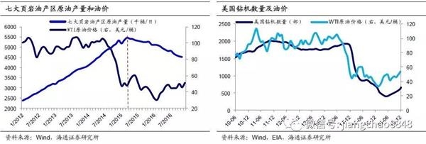 页岩油的供给将在油价超过盈亏线后加速释放,使得油价上涨有顶。15年油价跌至60美元/桶以下,页岩油产量迅速出现拐点,意味着页岩油的盈亏平衡线或在50-60美元/桶左右。因此,若油价上行超过页岩油成本,页岩油企业会迅速复产增加供给,过高的油价将难以持续。16年5月起,油价在50美元/桶上下止跌震荡,美国石油钻机数出现反弹,说明油企勘探在回升。OPEC减产短期提振油价后,页岩油供给将再次恢复,而如果全球需求没有实质性增长,国际油价或很难突破页岩油50-60美元左右的成本线。