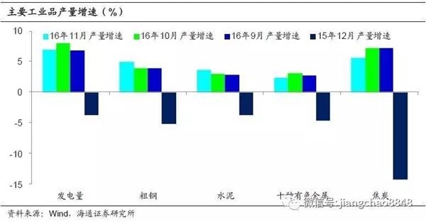 于是16年主要的工业品产量越去越多。由于16年工业品价格的普遍大幅上涨,主要工业品产量增速在8月几乎全部转正,在9-11月增速继续回升,与15年12月的增速普遍为负形成鲜明反差,这意味着工业品的产量越去越多。从经济学原理角度来看,涨价以后供给的动力只会越来越强,通过涨价是不可能去产能的。