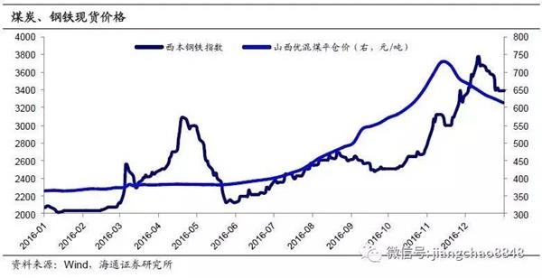商品价格筑顶,17年大概率稳中有降。由于供需关系的逆转和库存的回升,煤炭和钢铁价格已经见顶回落,其中动力煤从11月的峰值回落18%,钢价从12月峰值回落10%。因此,17年的工业品价格大概率稳中有降,难以出现16年大幅暴涨的格局。
