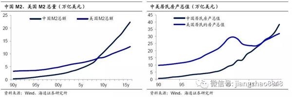 房价上涨透支购买力,导致人民币被高估。从货币的角度看,中国的广义货币M2在10年已经超过美国,目前几乎是美国的两倍。而从居民所拥有的房产(实物资产)的角度看,中国也在13年超过美国,但是中国的经济总量只有美国的一半左右,这说明房价上涨导致人民币的购买力被严重高估。