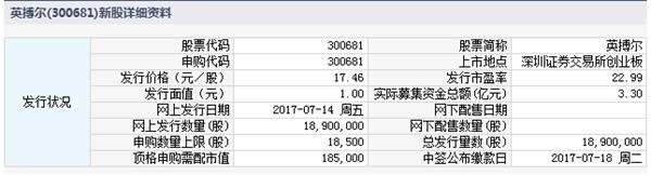 根据交易所公告,珠海英搏尔电气股份有限公司于2017年7月14日进行网上申购。本次发行股份数量为1,890万股,全部为新股,不安排老股转让。网上发行数量为1,890万股,占本次发行数量的100.00%。