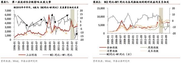 整个经济的第一层流动性结构,也即资金在实体和金融市场之间的分配(我们以M2同比-M1同比来反映)深刻影响A股走势,影响所有板块的绝对收益,也影响消费的相对收益,但与成长、周期、金融的相对收益,并无显著相关。