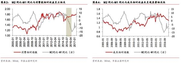 从历史数据来看,除了2015年杠杆牛市的特殊时期,A股与M2同比-M1同比呈现显著的负相关关系,而消费板块的相对收益则与M2同比-M1同比呈现显著正相关关系(原因在于消费板块的相对收益与上证综指显著负相关,消费是A股历史上每次下跌期的防御品种).