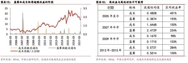 我们探讨性的以板块相对收益对板块成交量变化的敏感度来衡量资产的流通性,敏感度越高、流通性越差。我们看到在历史上风格偏大或偏小的时期,蓝筹或成长板块在取得超额收益的同时,流通性均变得相对差,但2013年-2015年却并不是这样。