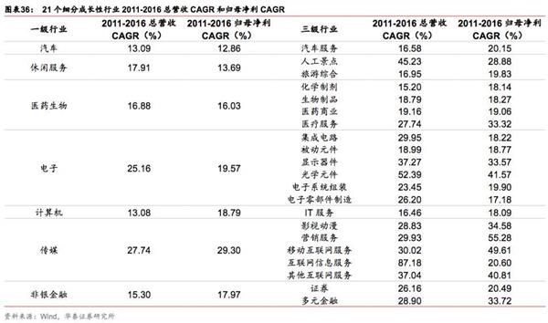首先,我们依据标准:1)一级行业2011-2016年营业总收入CAGR和归母净利CAGR皆超10%(剔除房地产和综合);2)三级行业2011-2016年营收收入CAGR和归母净利CAGR皆超15%;筛选出21个细分成长性行业:传媒(互联网信息服务、其他互联网服务、移动互联网服务营销服务、影视动漫、有线电视网络)、电子(被动元件、电子零部件制造、电子系统组装、光学元件、显示器件Ⅲ)、非银金融(多元金融Ⅲ、证券Ⅲ)、计算机(IT服务)、汽车(汽车服务Ⅲ)、休闲服务(旅游综合Ⅲ、人工景点)、医药生物(化学制剂、生物制品Ⅲ、医疗服务Ⅲ、医药商业Ⅲ).
