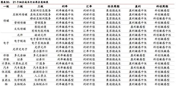 从分类结果来看:1)21个细分成长行业多属于利率敏感度较低、利好升值型、衰退滞胀期成长、盈利敏感较低;2)以科创敏感型成长居多,表明国内成长行业与美国科技创新周期联动紧密。