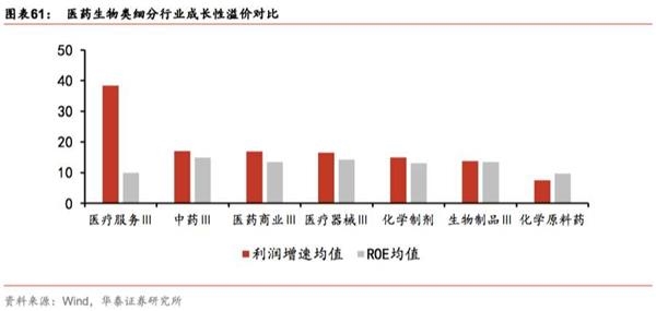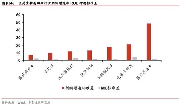 医药生物:从2010-2016年归母净利增速波动看,医药商业、医疗器械标准差最小,医疗服务波动最大;从ROE标准差看,生物制品、化学制剂波动性最小。