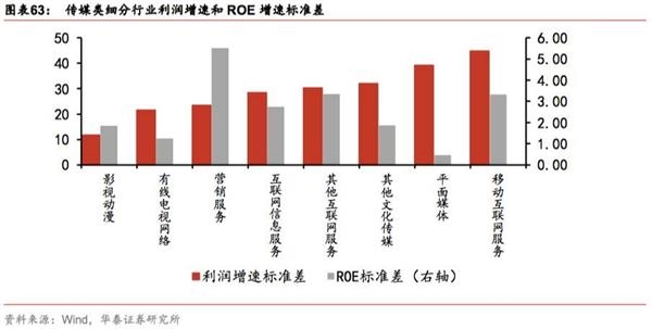 传媒:从2010-2016归母净利增速标准差看,影视动漫、有线电视网络、营销服务标准差最小;从ROE标准差看,标准差最小的是平面媒体、有线电视网络和影视动漫。