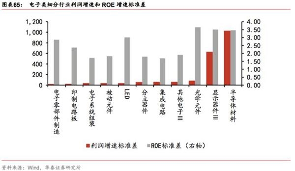 电子:从归母净利增速标准差看,电子零部件制造、印刷电路板和电子系统组装增速波动最小;从ROE波动看,标准差最小的则为集成电路、电子系统组装和分立器件。
