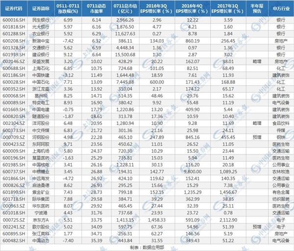 观察33只个股可以发现,基本都属于各自行业龙头,且又保持了良好的成长性。如歌尔股份作为电声行业的绝对龙头,2016年第三季度到2017年第一季度连续三个季度每股收益的增长率都超过了50%,半年报又预增40%-60%。东方证券预测公司2017-2019年每股收益分别为0.71元、1.00元、1.41元,给予目标价为22.0元,维持“买入”投资评级;中文传媒作为江西省文化传媒龙头,2016年第三季度到2017年第一季度连续三个季度每股收益同比增长逾20%,目前动态市盈率只有21.72。海通证券认为公司估值优势显著,看好智明星通后续产品表现,预计2017-2019年每股收益分别为1.14元、1.40元和 1.86元。给予“买入”投资评级,目标价27.36元。