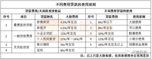而几乎无风险的投资收益中,银行理财5%/年左右,信托8%/年左右。所以,6%/年左右的贷款可以大量使用(公务员/事业单位/央企国企等员工有时能获得利息6%/年以内的信用贷),8%/年左右的贷款也是可以使用的,10%/年以上的贷款则要酌情使用,12%/年—18%/年以上的贷款只能做短期资金周转(俗称的过桥资金).