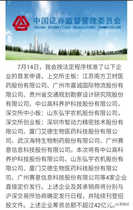证监会称,本次将有中公高科养护科技股份有限公司、山东弘宇农机股份有限公司、厦门艾德生物医药科技股份有限公司、广州赛意信息科技股份有限公司等4家企业直接定价发行。上述企业及其承销商将分别与沪深交易所协商确定发行日程,并陆续刊登招股文件。