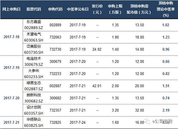 新股方面,本周5个交易日,共有9只新股可打。其中沪市主板有5只,中小板有2只,创业板有2只。分别是周二的东方嘉盛、岱美股份和禾望电气,周三的大参林和电连技术,周四的绿茵生态、设计总院和朗新科技,周五的华扬联众。