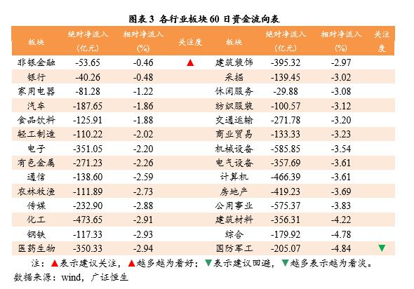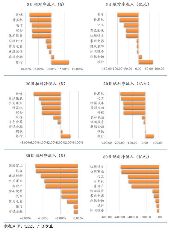 总体来看,5日方面资金流入靠前的板块:银行及非银金融;流入靠后的板块:传媒及计算机。20日方面资金流入靠前的板块:银行及钢铁;流入靠后的板块:传媒及纺织服装。60日方面资金流入靠前的板块:非银金融及银行;流入靠后的板块:国防军工及综合。