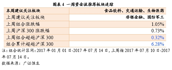 上周推荐关注的非银金融、国防军工位列申万28个一级行业的第2位、第14位,组合周涨幅为1.05%,相对沪深300超额收益为0.32%,2017年1月1日至今,我们推荐的周组合超额收益达到6.28%。