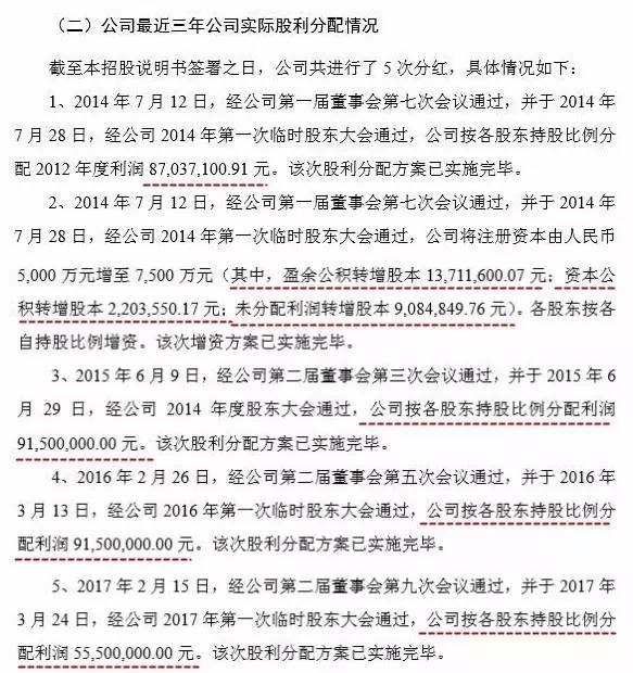 申报稿显示,大理药业最近三年共进行了5次分红,共分配利润32553.71万元和增资2500万元,该合计数额为募投项目的1.34倍(募投合计26249.92万元),占2012年至2016年净利润的85.26%(2012年至2016年净利润合计为41115.43万元).