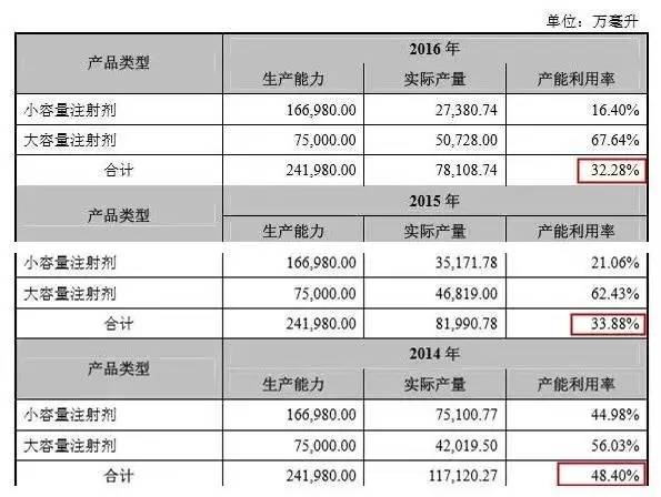 申报稿显示,大理药业2012年至2016年产能利用率分别为70.63%、57.79%、48.40%、33.88%、32.28%,产能利用率连续下滑。