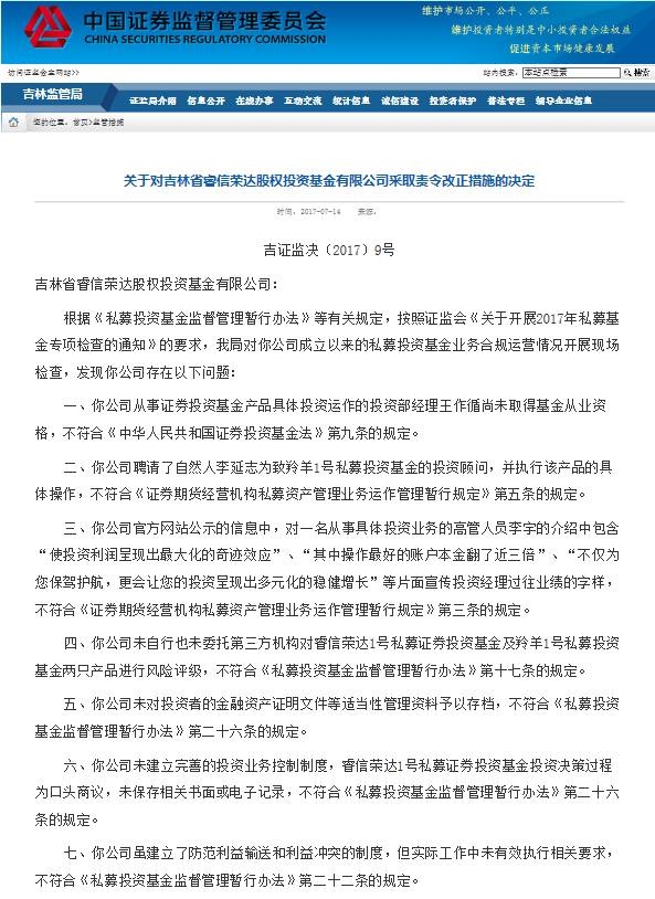 吉林证监局列举了睿信荣达这家私募出现的7个问题: