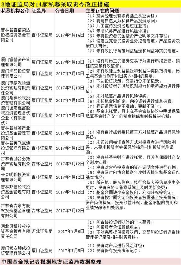 基金君从证监会网站发现,7月份以来,已经有吉林、厦门、河北等3个地区的证监局对辖区内的14家私募基金公司发出责令改正的监管措施决定。