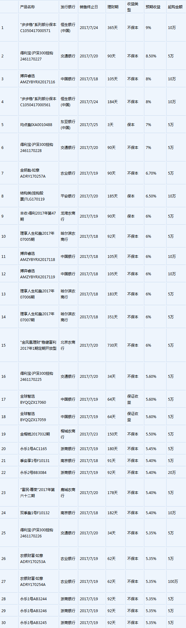 7月18日在售高收益银行理财产品:今日在售预期年化收益率在7%(含)以上的银行人民币理财产品共6款。恒生银行(中国)发行的“‘步步稳’系列部分保本C1050417000571”预期年化收益率最高,为9%。