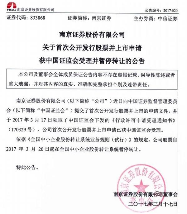 南京证券是一家在新三板挂牌的券商。在全国中小企业股份转让系统(以下简称“股转系统”)上可以看到,它在提交了首次公开发行股票并上市的申请文件后,于今年3月17日获得证监会受理。依据《全国中小企业股份转让系统业务规则(试行)》的规定,公司股票在3月20日(周一)起在股转系统上暂停了转让。
