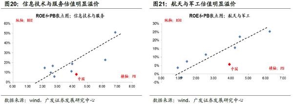 新兴行业:A股新兴行业(包括软件与服务、技术硬件与设备、信息技术与服务、航天与军工)大多为创业板上市公司,虽然三次“股灾”之后,创业板整体的估值水平大幅下行(PE从高点的143.26下行到目前的56.63,下行了64.66%;PB从高点的11.53下行到目前的4.51,下行了60.88%),但创业板整体的估值水平依旧不低。这造成在A股新兴行业出现结构性高估:多数行业的PB在5倍左右,而盈利能力仅为10%左右。