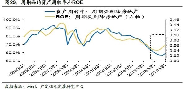 周期板块资产周转率的回升是由收入增速的大幅提升导致的,而非供给收缩贡献的,不具有可持续性。17Q1,周期品行业的收入增速和资产增速均出现回升,同时,收入增速回升的幅度远高于资产增速,这带来周期品行业的资产周转率的提升;不过,由于大宗品价格已经进入下行区间,周期品的收入增速无法持续高增长,这使其资产周转率的回升也不具有可持续性。
