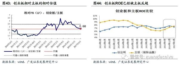 创业板的相对PB依然不低,随着外延式并购的退潮,创业板的PB有进一步下行的压力。创业板相对主板的相对PB在2.6倍左右,处于历史均值水平;创业板的相对PB(净资产的价格)较高,反应市场对于创业板ROE(净资产的盈利能力)持续增长的预期;随着外延式并购的退潮,创业板的ROE已经被主板反超,并有可能持续下行,因此,中期来看,创业板的PB有进一步下行的压力。