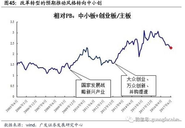 从过去历史经验来看,市场中长期风格转向小盘股的契机并不在于相对估值的见底,而是需要诞生大故事、大逻辑来支撑小盘股“看长做短”,而目前来看这还需要更长期的等待。由于创业板成立时间较短,我们进一步加上中小板来回顾一下小盘股相对大盘股的相对PB变化(见下图)。可以看出历史上中小板+创业板相对主板的相对PB其实并没有固定的顶部和底部,即并不是要等到相对PB触及历史低点风格才会转向小盘股。而历史上有两次比较持续的风格偏向小盘股,一次是2009年下半年到2010年,一次是2013年到2015年上半年。这两次持续的风格转换,我们认为更重要的是背后的大时代背景变化——2009年下半年,最高决策层首次提出了发展“战略性新兴产业”进行产业结构转型,此后密集出台了系列政策方针,对以新兴行业为主的小盘股营造了极佳的政策环境;2013年新一届领导班子上台以后,又提出了 “互联网+”、“工业4.0”、“大众创业、万众创新”等新的口号来大力发展新兴产业,再加上创业板公司开始掀起兼并收购浪潮,这都帮助提升了小盘股的估值。可见,在一个“看长做短”的市场环境下,真正可持续的风格转换一定需要大故事、大逻辑来支撑。而今年小盘股通过外延收购实现高增长的大逻辑已经明显减弱,新的“大故事”又还讲不出来,因此我们认为即使有风格转换也是极短期的现象,操作难度极大,真正值得参与的风格转换还需要更长期的等待。