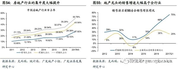 在行业集中度大幅提升的背景下,重点关注地产行业龙头股的投资机会。中国房地产市场的集中度在持续提升,据测算,前50大地产公司的市占率已经超过50%;在行业集中度显著提升的背景下,地产龙头的销售增速始终高于行业整体,特别是2016年下半年以来,地产行业整体的销售增速持续下行,但地产龙头公司的销售增速依然大幅加速。