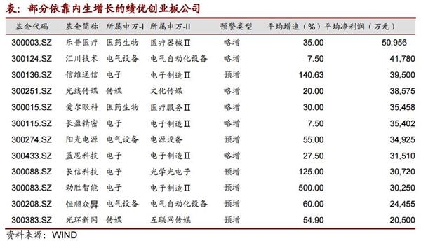对创业板而言,如果一定要寻找依靠内生增长的公司,建议从医疗、电子、通信、电气设备等着手。上述细分行业的几家上市公司,主要依靠内生增长仍然获得一定的高增长。