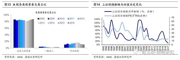 近一年多来A股振幅和估值下降,源于机构投资者和外资占比提升。对比A股和台、韩市场的投资者交易结构,截止2016年,A股散户投资者成交占比87%,远高于台湾的56%和韩国的46%。国内机构投资者成交额占比10.5%,也低于台湾的17%和韩国19%。且台、韩市场中外资成交额占比已分别达到26%、32%,而国内外资成交额占比仍非常低。从台湾、韩国对外开放的历史经验可以看出,外资投资者占比不断提升的过程有助于改善市场中的投资者结构,从而使得市场投资风格更理性,市场也会表现得更加稳定。A股的振幅和估值水平变化显示市场已经处于不断发展完善过程中。1991-1999年上证综指大幅震荡,年均振幅约80%,上证综指PE(TTM)水平也始终在40倍左右。而2000年以来,上证综指年均振幅约50%,上证综指估值水平也逐步回落至14倍左右。近一年多以来,上证综指振幅降至25%,估值维持在14倍左右,市场稳定性提高,投资风格偏向大盘蓝筹股,原因在于散户投资者占比降低,而机构投资者和外资占比在上升,A股国际化进程加快将强化这一趋势。