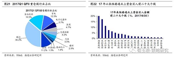 16年下半年来,A股价值和成长风格裂口不断拉大源于盈利趋势和投资者结构变化,国际化强化此趋势。台湾、韩国历史经验显示,资本市场中外资占比提升阶段,价值股、大盘蓝筹股表现更佳。我们前期报告《盈利趋势决定风格-20170625》分析指出,市场风格主要取决于盈利增速趋势、投资者结构。而资本市场国际化则主要影响了投资者结构。台湾、韩国市场国际化阶段,散户成交占比降低,机构、外资成交占比上升,市场投资风格更加理性。17年以来大盘蓝筹股继续大涨,A股漂亮50走出独立行情,上证50、中证100指数走出牛市形态,投资者结构的变化也是重要原因。前期报告《谁在买漂亮50<span style="“margin:0px;padding:0px;max-width:100%;font-family:楷体_gb2312;box-sizing:border-box" !important;word-wrap:break-word="" !important;“-20170629》中分析过,从配置资金角度来看,a股漂亮50的买盘来自公募和陆港通北上资金。统计17年以来陆港通北上资金买入金额前二十大个股,其中主要是以海康威视、美的集团、格力电器、中国平安等为代表的国内大盘蓝筹股。a股国际化加速背景下,将吸引更多外资配置a股。17q1的qfii重仓股行业占比显示,qfii在a股更偏好银行、食品饮料、家电、电子元器件等行业。a股国际化加速的背景下,估值和业绩匹配的大盘蓝筹股更受益。
