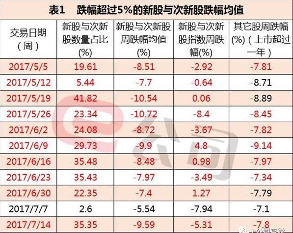 自2017年3月27日次新股指数创出阶段性高点后,板块指数便一路下滑,炒作明显降温。统计5月份以来的“闪崩”股发现(为方便分析,以周跌幅超过5%的股票为研究对象,表1),每周次新股“闪崩”股数量占总“闪崩”股的比例都超过20%,占所有次新股总数的80%以上。与上市时间超过一年的股票对比,次新股跌幅均值也大多比前者要高。
