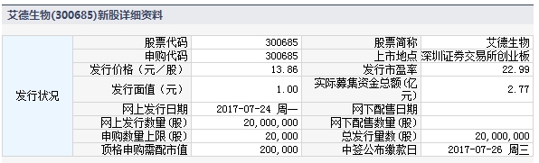 根据交易所公告,厦门艾德生物医药科技股份有限公司于2017年7月24日进行网上申购。本次公开发行股票总数量2,000万股,网上发行2,000万股,占本次发行总量的100%。本次发行股份全部为新股,不安排老股转让。