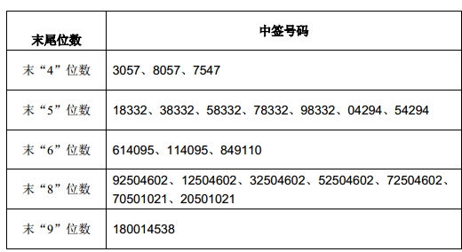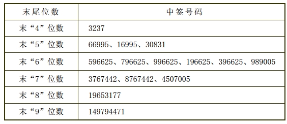 凡参与本次网上发行的投资者持有的申购配号尾数与上述号码相同的,则为中签号码。中签号码共有73,080 个,每个中签号码只能认购1,000 股设计总院A股股票。