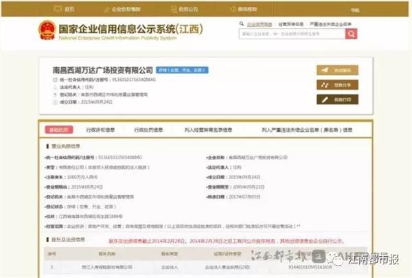 南昌西湖万达广场于2015年9月24日在南昌市西湖区市场和质量监督管理局登记成立,投资人为大连万达商业地产股份有限公司,注册资本1000万元人民币,法定代表人为齐界,经营范围为实业投资;房地产开发、经营。