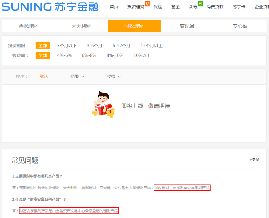 查询苏宁金融官网可以发现,公司旗下的固收理财产品已经全部下线,页面显示为“即将上线敬请期待”。