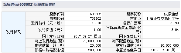 根据交易所公告,杭州纵横通信股份有限公司于2017年7月27日进行网上申购。本次公开发行股票总数量为2,000万股。网上发行2,000万股,占本次发行总量的100%。本次发行股份全部为新股,不安排老股转让。