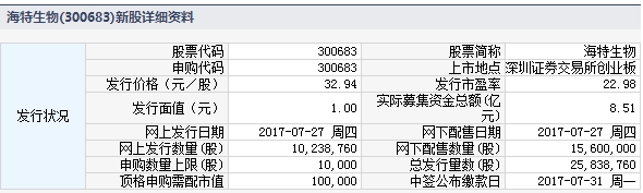 根据交易所公告,武汉海特生物制药股份有限公司于2017年7月27日进行网上和网下申购。本次发行数量为25,838,760股,占发行后总股本的25.00%,全部为发行新股,无老股转让。其中,回拨前网下初始发行数量为15,600,000股,占本次发行数量的60.37%;网上初始发行数量为10,238,760股,占本次发行数量的39.63%。
