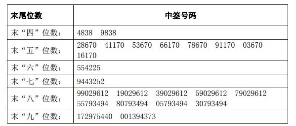 凡参与网上定价发行申购深圳市智动力精密技术股份有限公司股票的投资者持有的申购配号尾数与上述号码相同的,则为中签号码。中签号码共有56,340个,每个中签号码只能认购500股深圳市智动力精密技术股份有限公司股票。