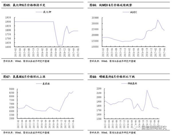 化肥农药方面,尿素出厂价6月环比增速8.6%,较上月-8.2%的环比增速大幅提升,磷酸二铵价格环比增速-2.1%,略高于上月-4%大幅下降,复合肥价格与上月持平。纤维原料方面,苯酐6月环比增速0.1%,低于上月4.8%的环比增速,涤纶短纤6月环比增速2%,高于上月-2.7%的环比增速。粘胶短纤1.5D 5月环比增速-2.1%,高于上月-4.1%的环比增速。氨纶40D 6月环比增速-3.8%,低于上月-0.7的环比增速。基础化工方面,轻质纯碱6月环比增速7.6%,高于上月-5.9%,烧碱6月环比增速1.4%,高于上月0.8%,氯化钾价格与上月持平,纯MDI 5月环比-7.3%,高于上月-13%环比增速。其他化工原料氢氟酸5月环比增速3%,高于上月-1.4%环比增速,碳酸氢钙环比下跌1.5%。三氯氢硅、钛白粉价格与上月持平。