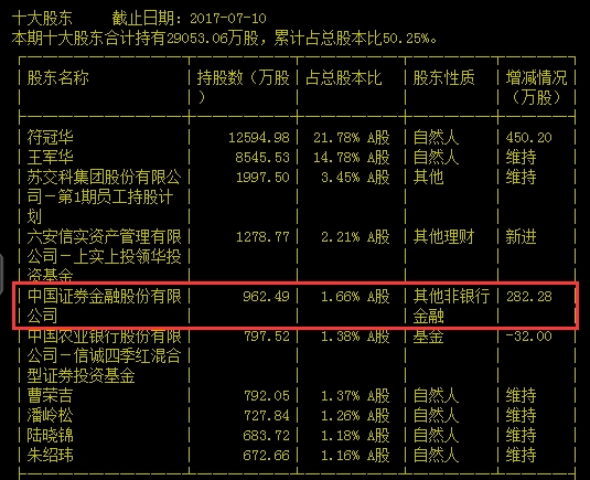 苏交科最新前十大股东名单中,证金公司赫然在列,持有962.49万股,占比1.66%,位居第五大股东。