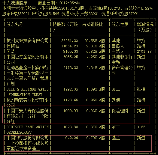 华策影视半年报数据显示,一只基金和一只保险理财产品进入了十大流通股东中: