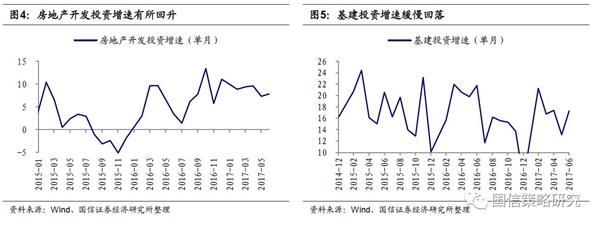 第二,固定资产投资总量增速回升,制造业和房地产开发投资增速在回升,基建投资增速缓慢回落。市场之前对于2017年经济下行的担忧主要来自基建和房地产投资下行带来的固定资产投资增速潜在下行冲击。但从现在的情况来看,上半年基建投资累计增速16.9%,基建增速下行的非常缓慢,甚至16.9%的增速还是要高于2016年全年15.7%的增速。而房地产开发投资增速上半年累计同比8.5%,比去年全年提高1.6%,仍在回升过程中;制造业投资增速上半年累计同比5.5%,比去年全年提高1.3%。