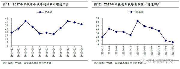 从已经公布的中报利润信息来看,中小板和创业板净利润增速在持续下滑(中小板和创业板上市公司基本全部已经发布业绩预告等相关利润信息),按可比口径统计,2017年中小板和创业板上市公司净利润累计同比增速为31.4和6.1%,2017年一季度为34.2%和10.4%。